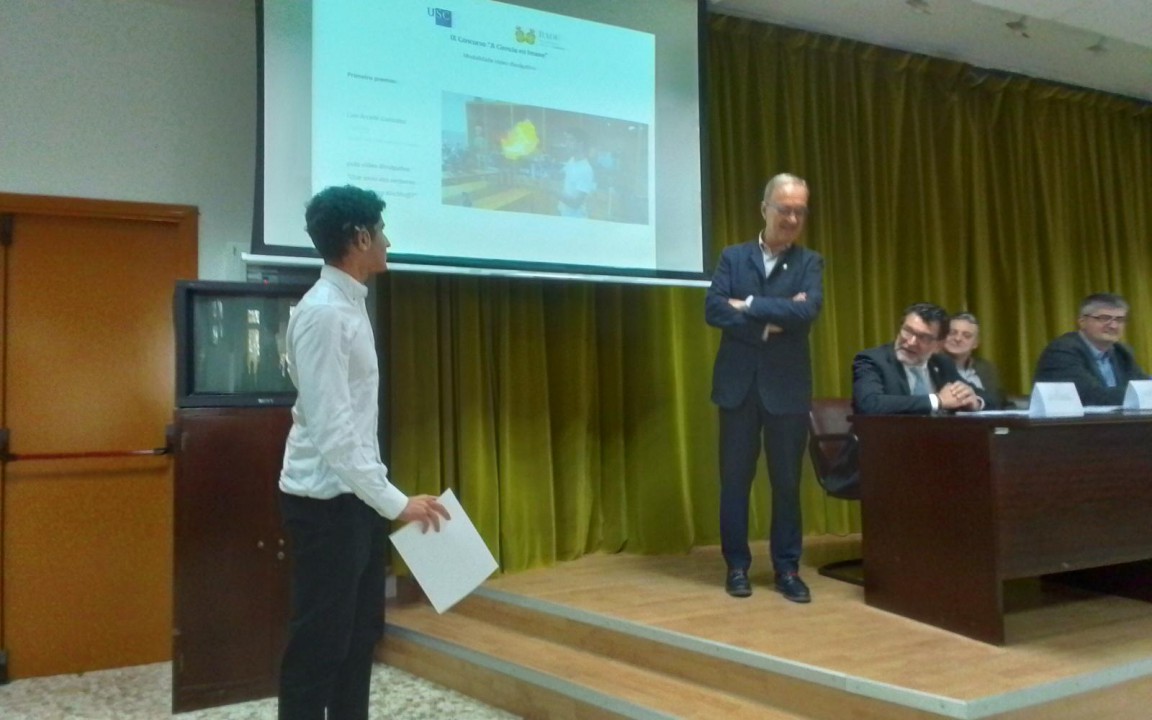 El alumno de 4º de la ESO, Luis Arcelle ha resultado ganador del IX Concurso "A Ciencia en Acción", que organizan la USC y la Real Academia de Ciencias, un primer premio dotado con 250€. Hoy martes recogió el galardón, junto con el profesor Carlos Pérez Freire, en la Facultad de Física de la USC con motivo de la celebración de San Alberte Magno, patrón de las Ciencias. ¡Enhorabuena!