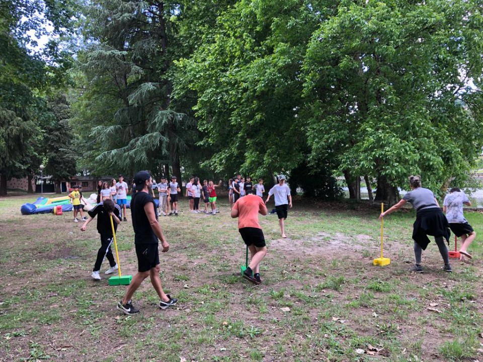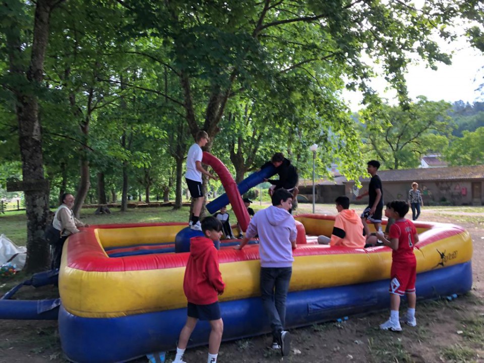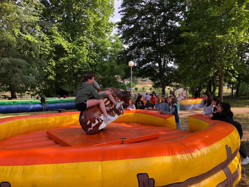 Excursión de 1º de la ESO al camping de Leiro, con actividades como el toro mecánico, futbolín humano, pista americana, tiro con arco, lucha de hinchables, canoas, juegos de agua...