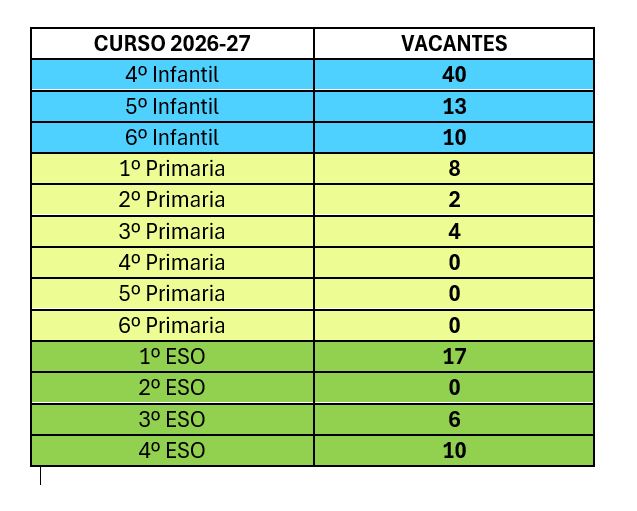 En la fecha de publicación las vacantes son PROVISIONALES y están sujetas a modificaciones en el caso de que algún puesto escolar sea ocupado durante el plazo extraordinario de escolarización del presente año académico 2025/26.